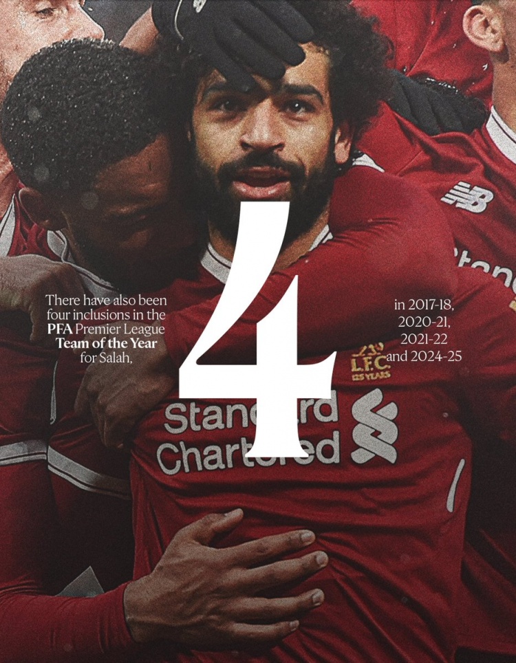 个人荣誉簿上,萨拉赫的名字熠熠生辉。4次英超金靴,与亨利并列历史最多;3次PFA年度最佳球员,历史首人;4次入选PFA年度最佳阵容;3次当选FWA年度最佳球员;7次当选英超月最佳,与阿圭罗、凯恩并列最多